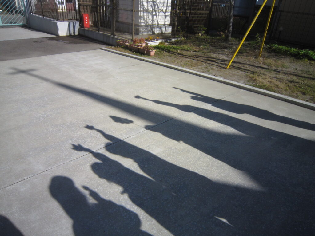 お気に入りの葉っぱをもって十字架の影と一緒に並んで記念撮影!