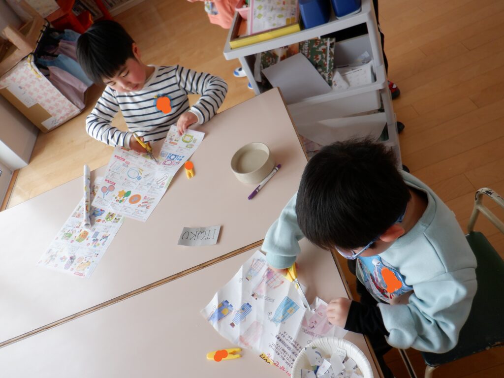 工作コーナーでは、はさみに熱中している、たんぽぽの子たちがおりました。